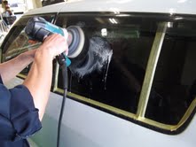 3)サイドガラスなどの強化ガラスは専用バフでポリッシャーを掛けます