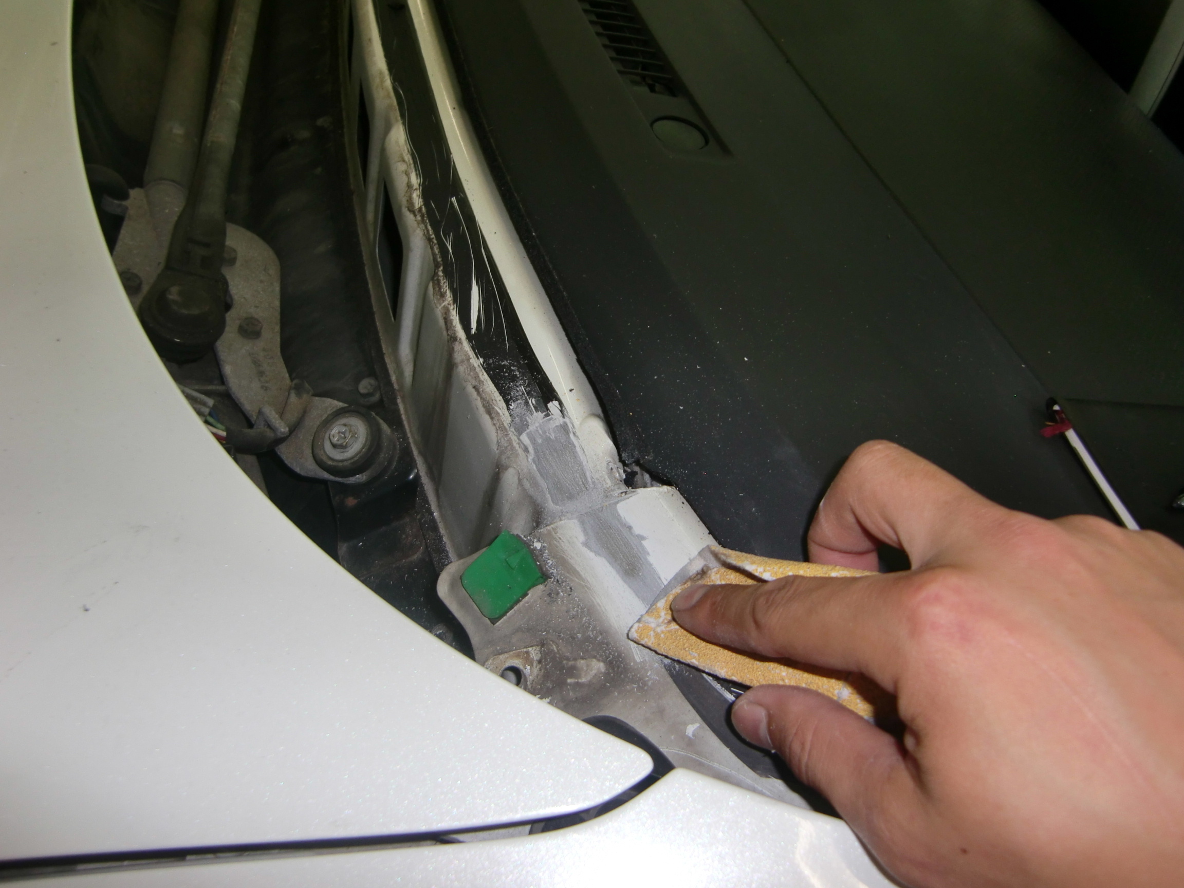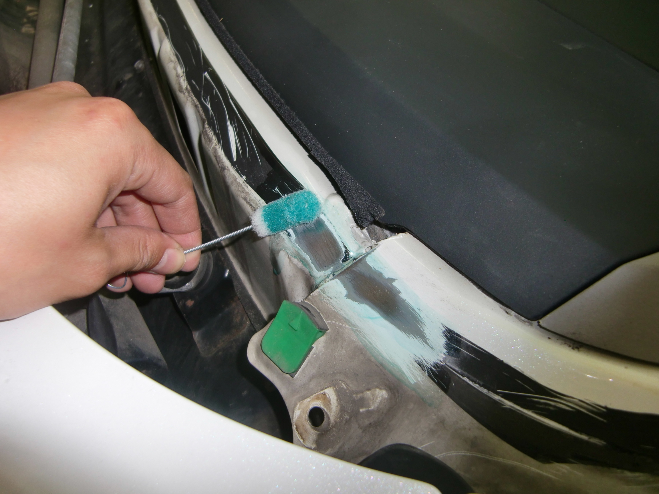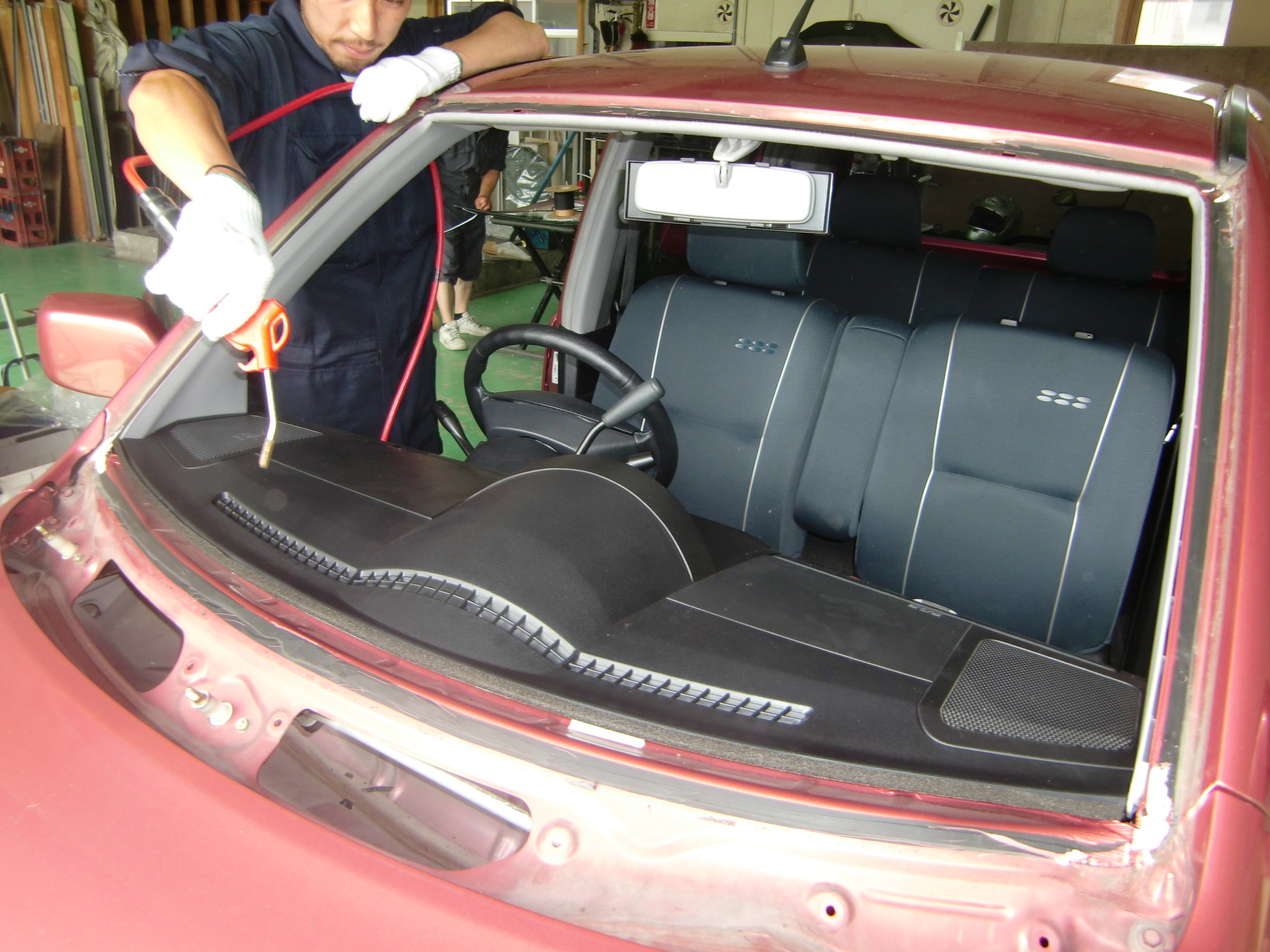 7)さび止めプライマー処理をして、新しいガラスを接着します。